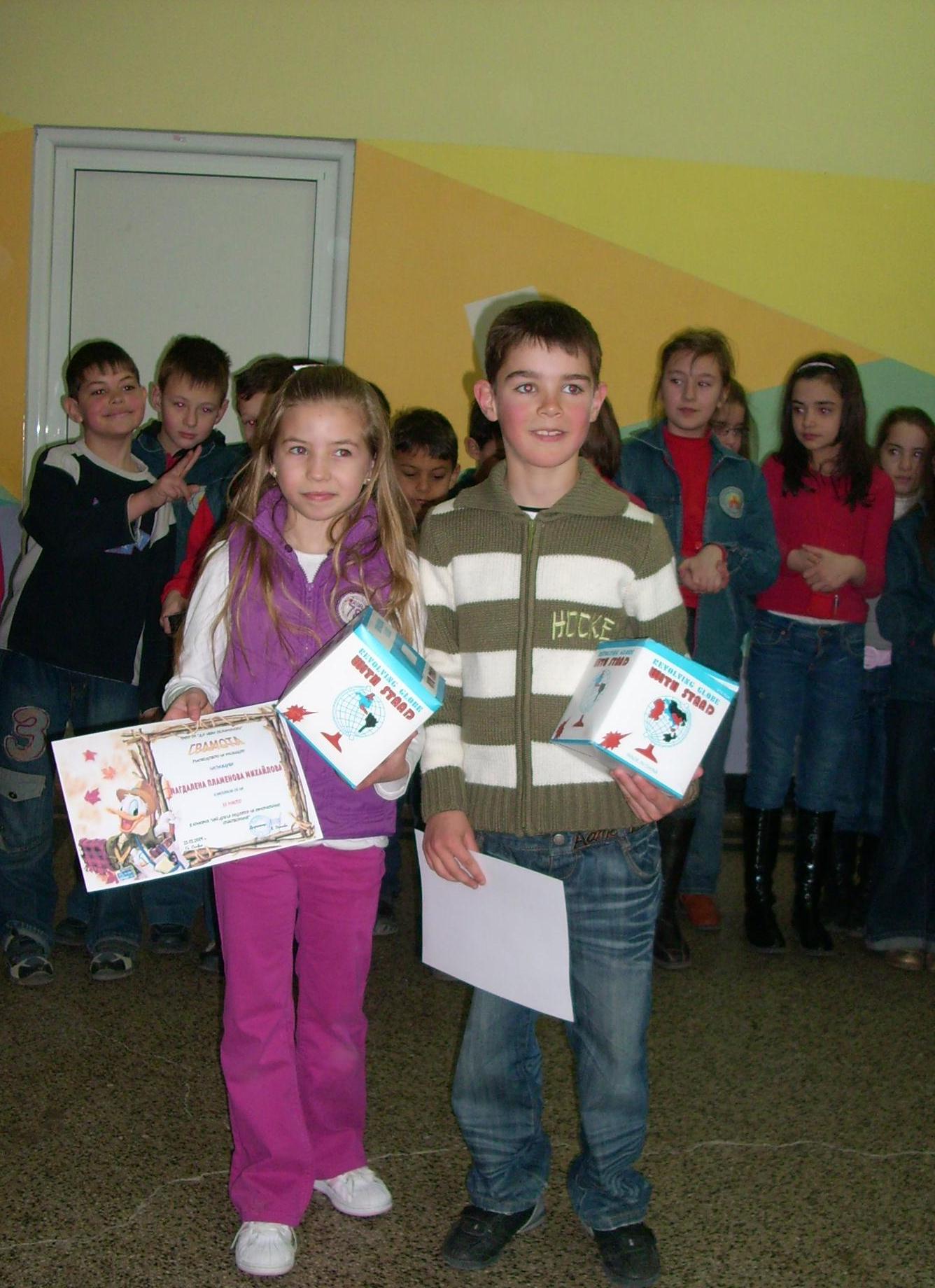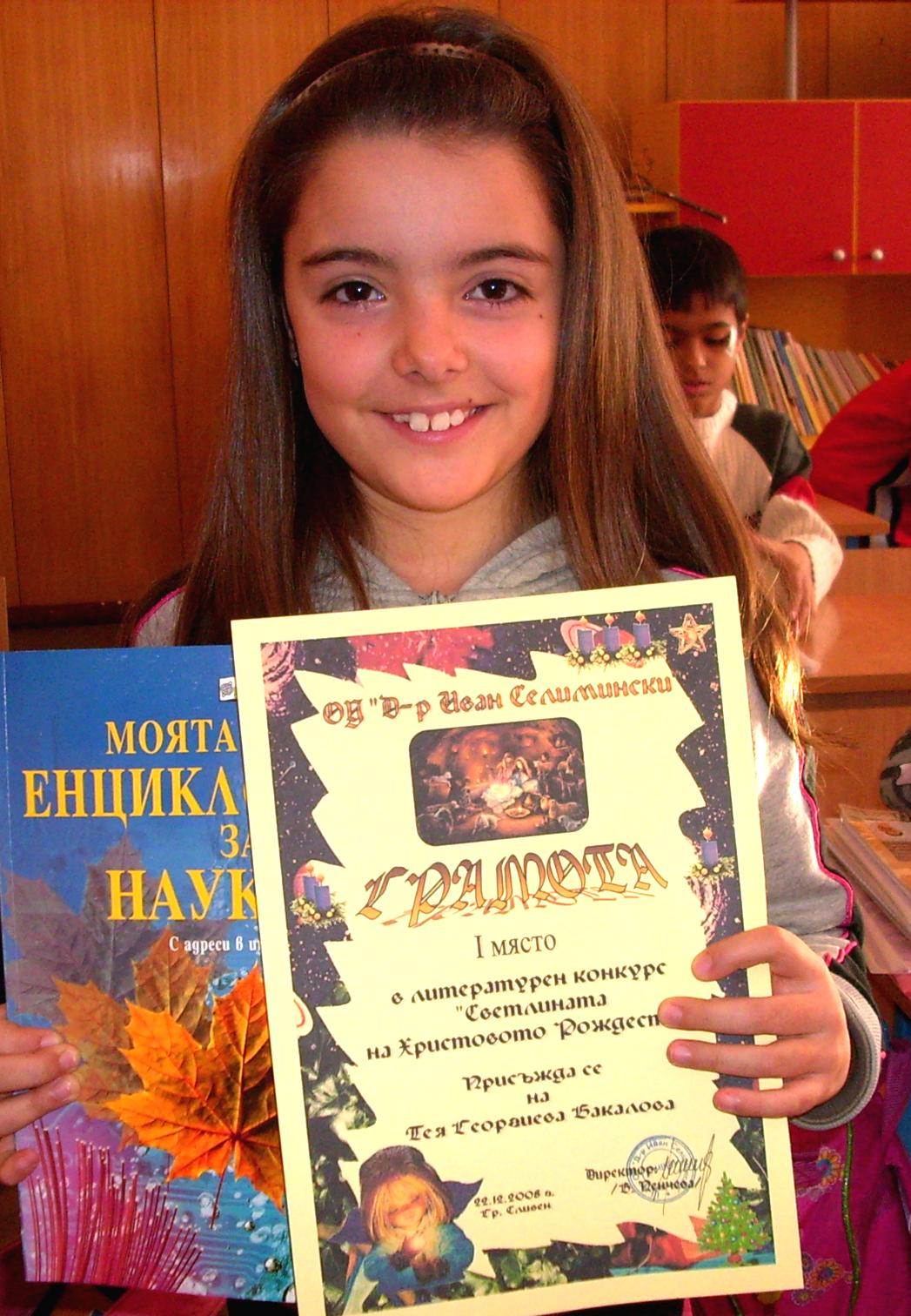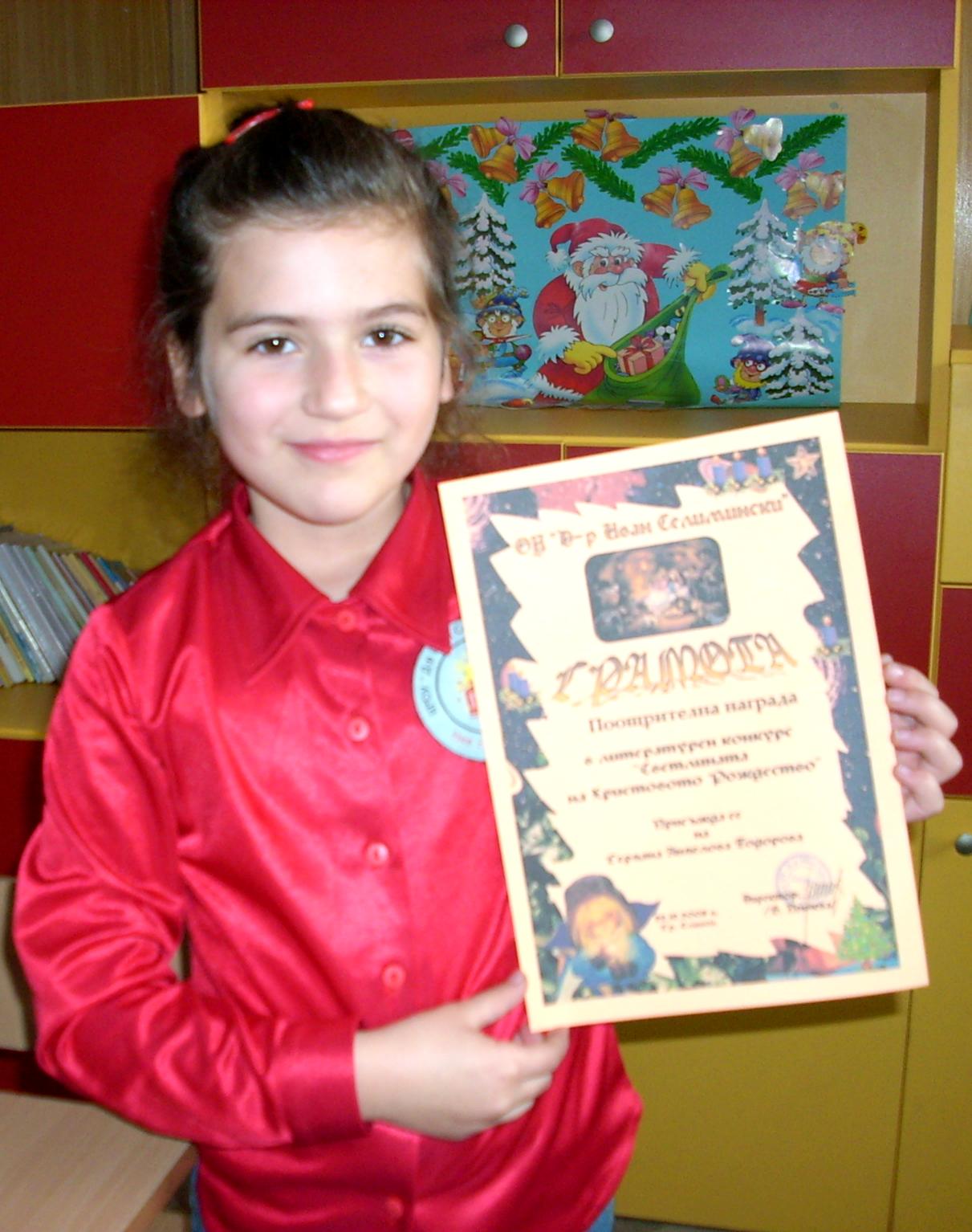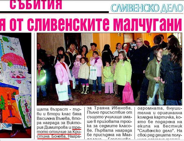 В традиционните училищни коледни конкурси наши съученици спечелиха много призови места. В конкурса за рисунка "Магията на Коледната нощ" Тина - Мария подели първото място с Даниел Динев от 4 "а" клас, Тея и Нелина заеха второ място, а Пролетина е трета. В литературния конкурс Белла спечели първо място заедно с Георги от 4 "б" клас, а поощрителни награди получиха Тея, Гергана, Габриела и Тина-Мария.