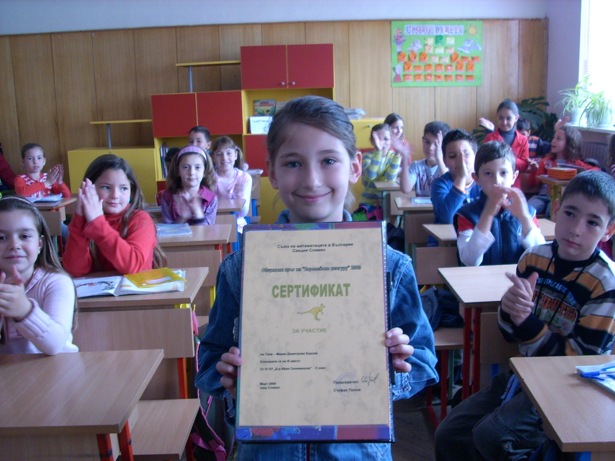 Тина-Мария се класира на 3-то място в град Сливен в математическото състезание "Европейско кенгуру" през 2009 г. и получи своя сертификат.